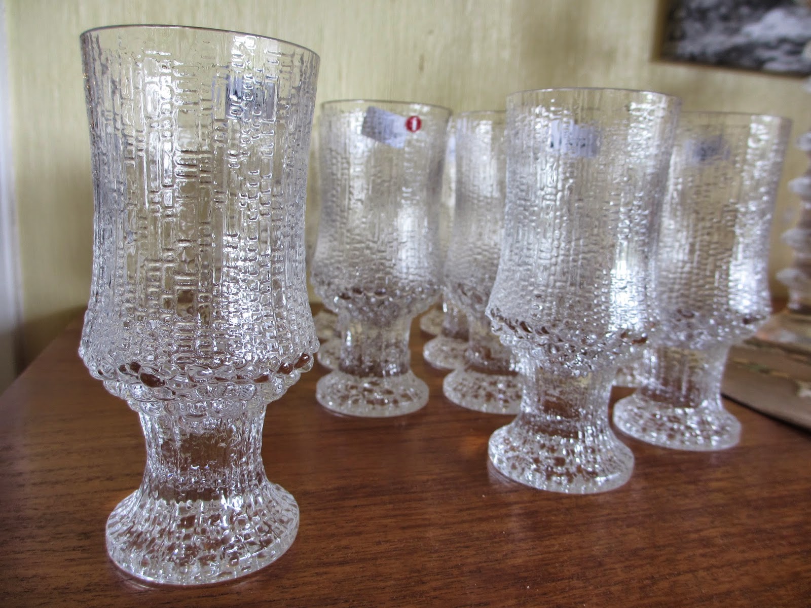 Så mycket loppisbesök blev det ju inte, men jag sprang på en jättemysig liten affär i en källarlokal "nånstans på väg mellan Haga och Avenyn". De hade jättemycket fint, inte billigt, men det var heller inte skrämselhickapriser. Och inte gick jag tomhänt därifrån, för längst in i lokalen står det ett dussin(!) vitvinsglas i serien Ultima Thule. Den vackraste av alla Iittalas glasserier. Jag samlar, men vitvinsglasen hade jag inte lyckats hitta ett enda, förrän nu. Så visst var det väl så, att det där dussinet stod och väntade på mig.